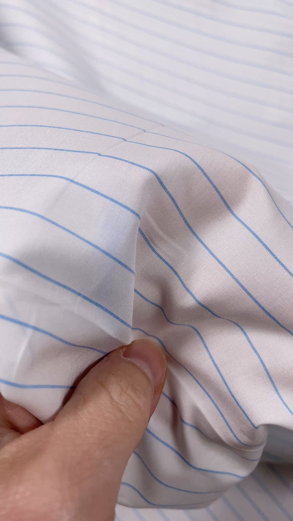 Frisch, leicht und einfach wunderschön – dieser weiße Baumwollstoff mit hellblauen Streifen bringt sofort Sommerlaune in dein Nähzimmer. Mit seinen 120 g/m² ist er angenehm dünn, atmungsaktiv und wunderbar weich im Griff – perfekt für Nähprojekte, die sich leicht und luftig anfühlen sollen.