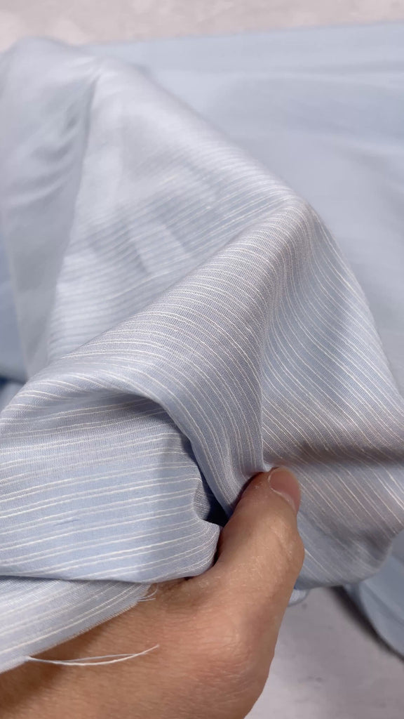 Ein Hauch von Sommer weht dir mit diesem hellblau/weißen Baumwoll-Leinenstoff entgegen. Leicht, luftig und mit seiner fein gewebten Struktur (120 g/m²) bringt er genau die richtige Mischung aus natürlicher Kühle und softer Weichheit mit. Das Leinen sorgt für den charakteristischen, leicht trockenen Griff und die tolle Atmungsaktivität, während die Baumwolle den Stoff angenehm geschmeidig macht.